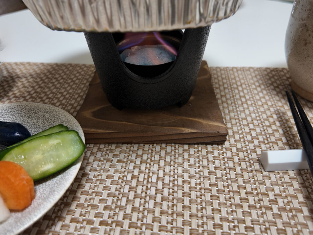 ※固形燃料の炎を直接 食べ物にあてると、 アルコール臭がついたり、成分が口に入ることがあります。